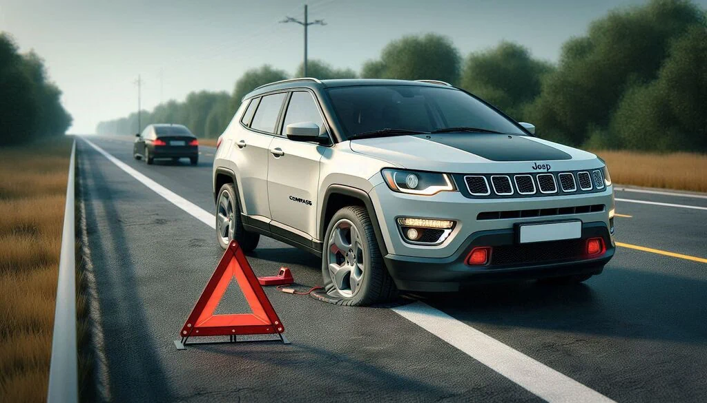 Pull over to a safe, flat area away from traffic. Turn on your hazard lights, place emergency warning triangle if available and engage the parking brake to prevent any movement while changing the tire.